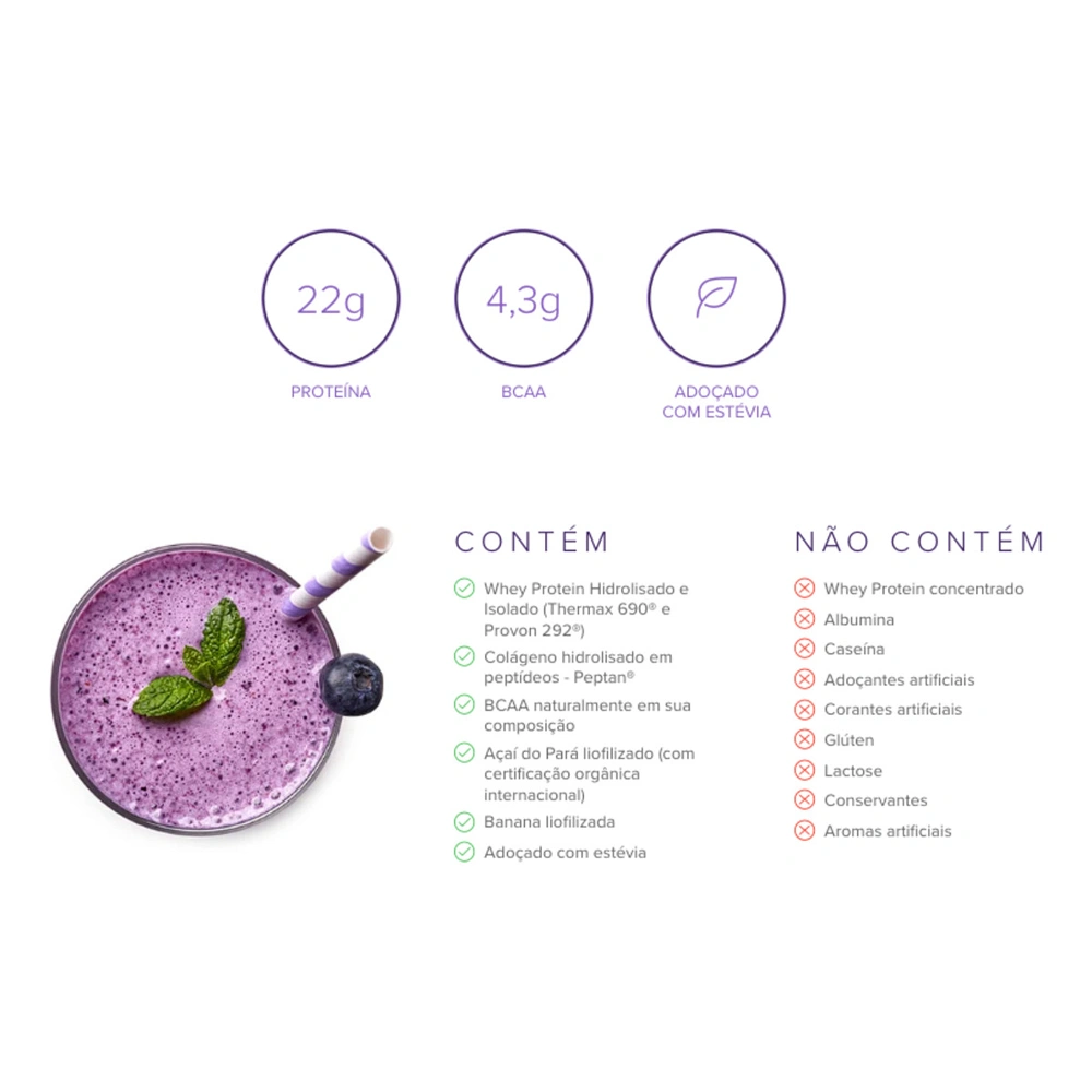 Proteínas hidrolisada e isolada do soro de leite (Thermax®690 e Provon®292), colágeno hidrolisado em peptídeos (Peptan®), açaí liofilizado em pó (com certificação orgânica internacional), banana liofilizada em pó, polpa de açaí em pó, goma guar, ácido ascórbico, palmitato de ascorbila, acetato de tocoferol, antiumectantes fosfato tricálcico e dióxido de silício, aroma natural, edulcorante glicosídeos de esteviol (estévia).