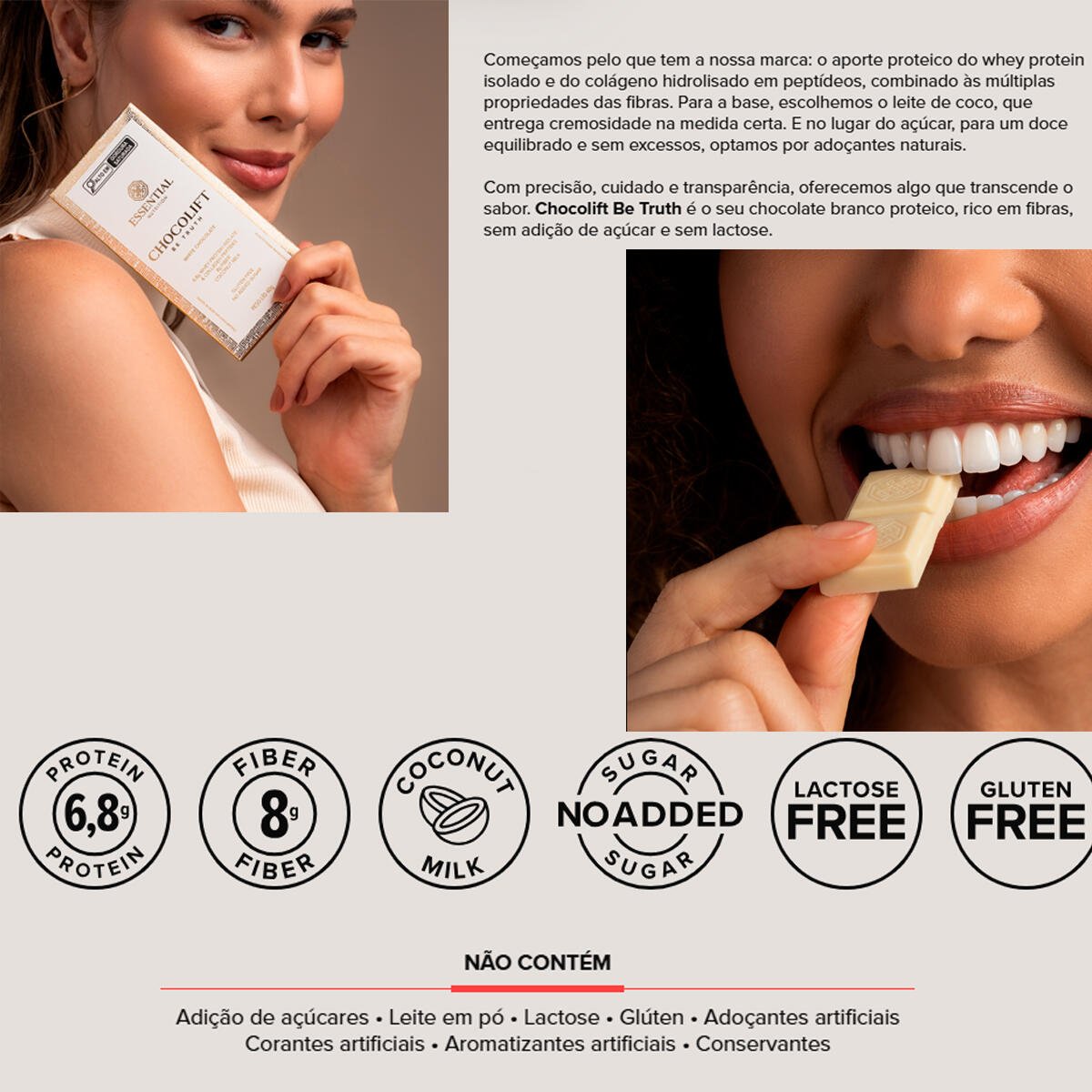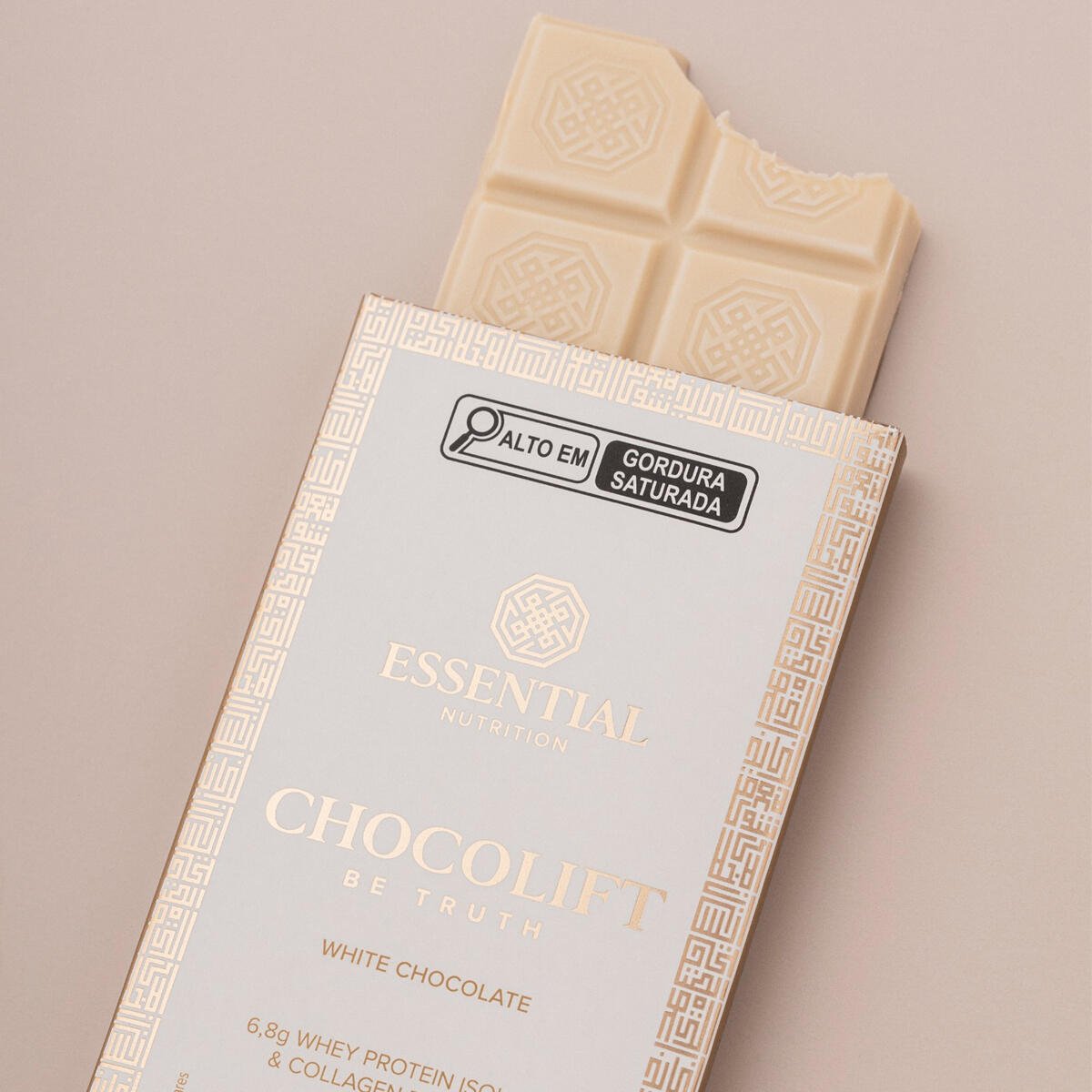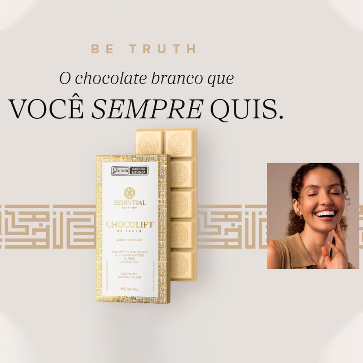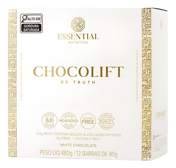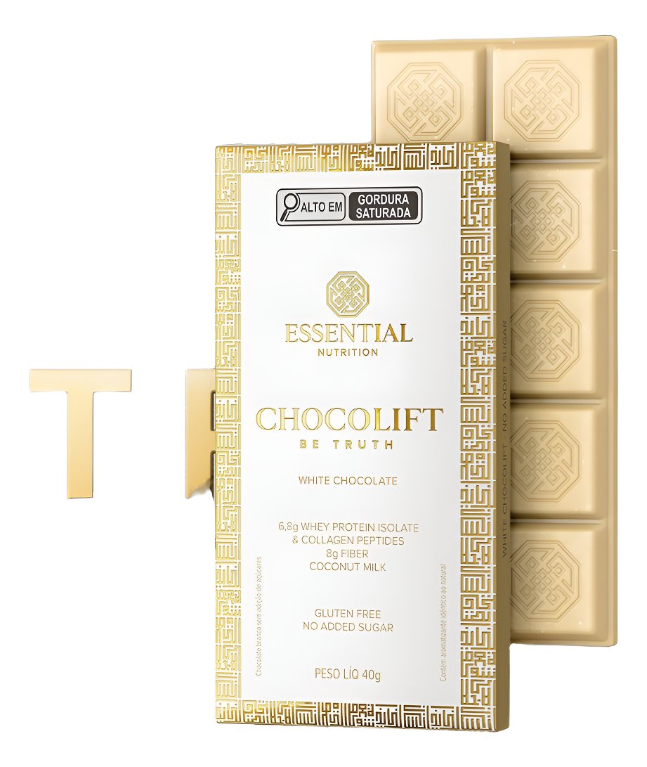 Chocolift Be Truth é o chocolate branco proteico que você sempre quis: whey protein isolado, colágeno hidrolisado em peptídeos e fibras, sobre uma base cremosa de leite de coco. Adoçado apenas com fontes naturais, sem adição de açúcar e sem lactose.