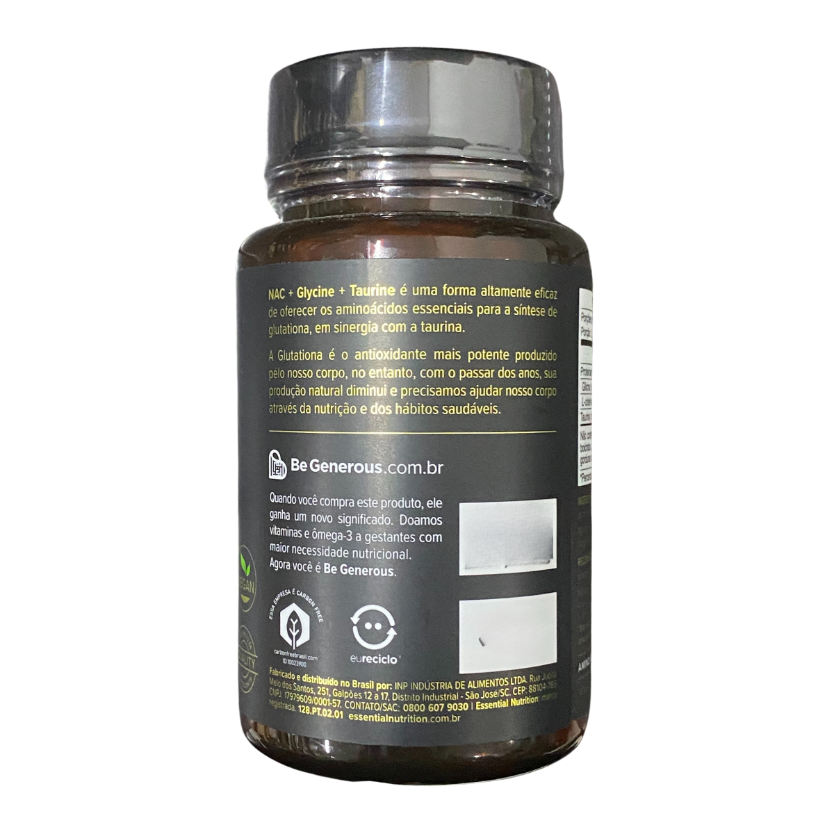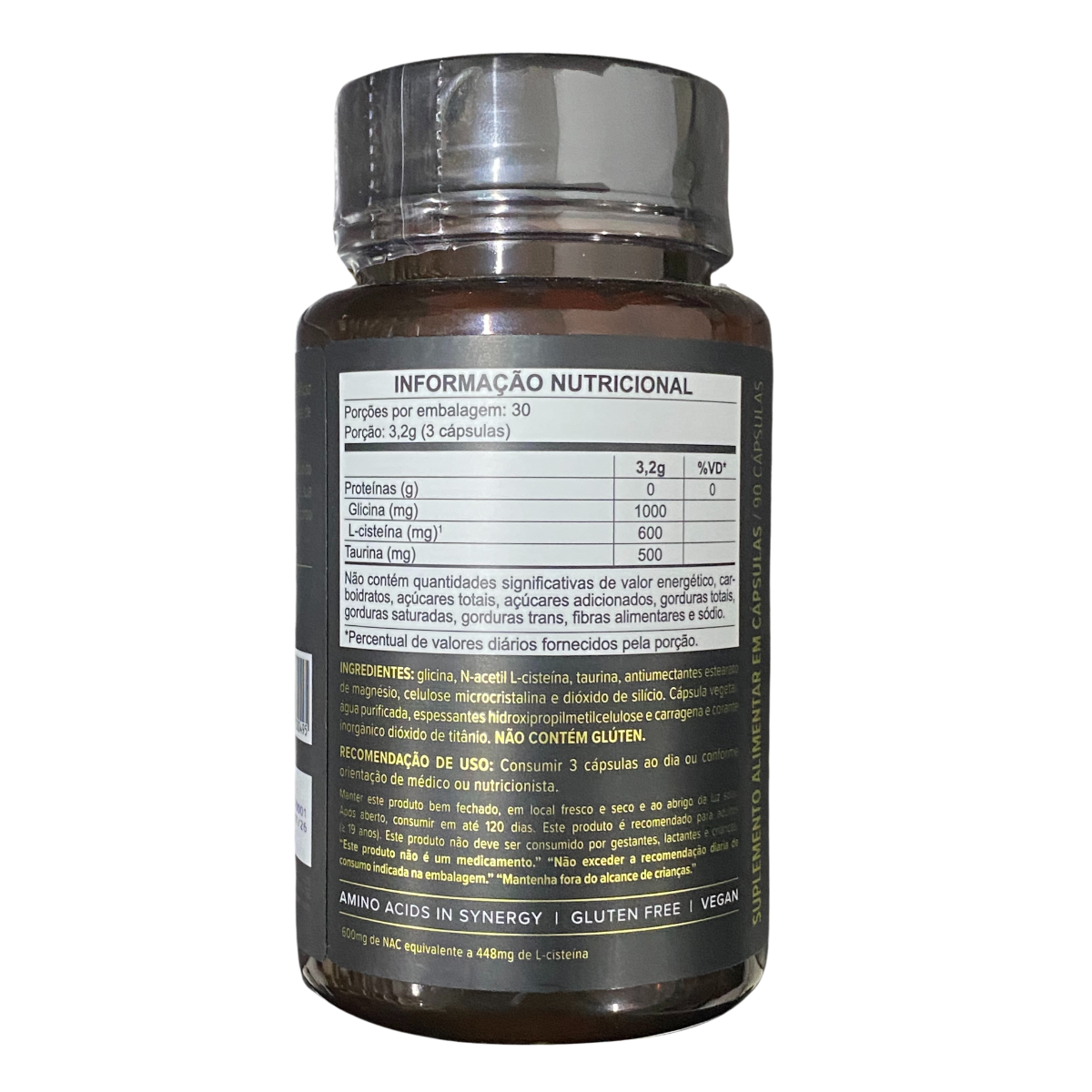 Glicina, N‑acetil L‑cisteína, taurina, estearato de magnésio, celulose microcristalina, dióxido de silício. Cápsula vegetal: hidroxipropilmetilcelulose, carragena, dióxido de titânio.